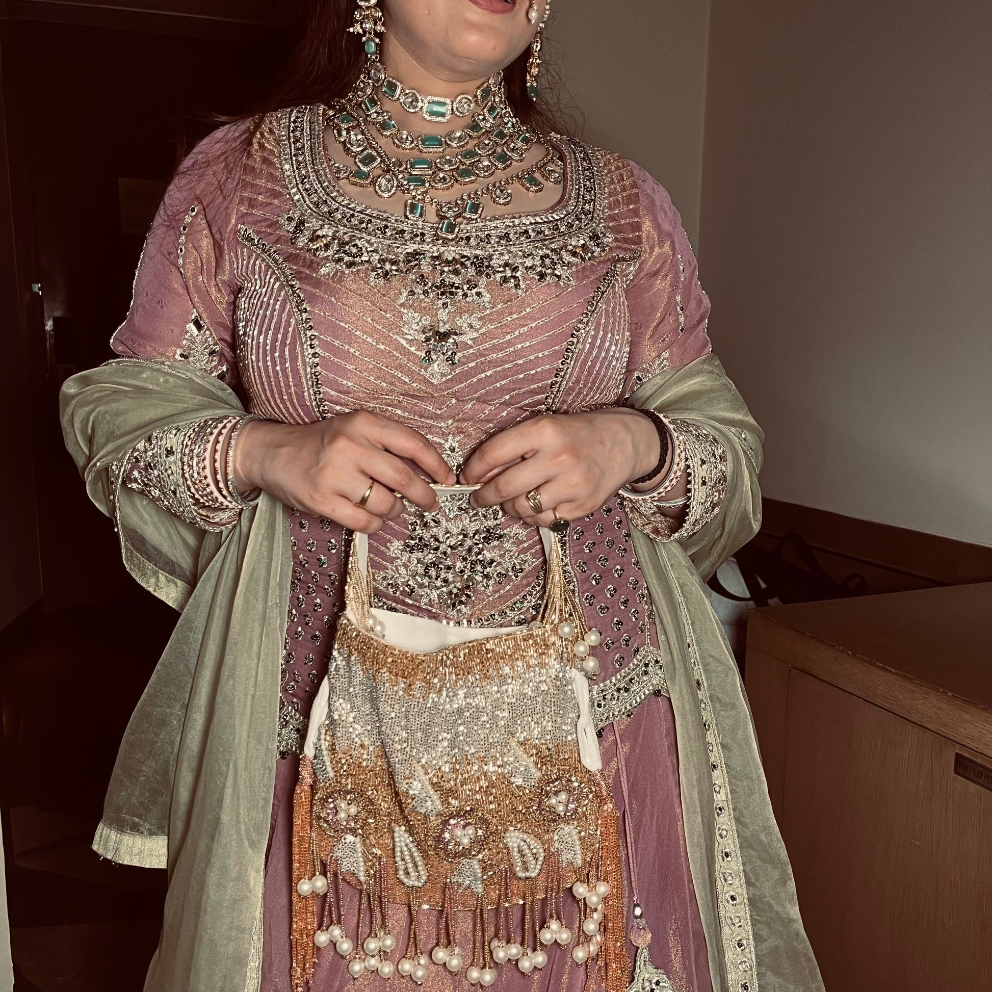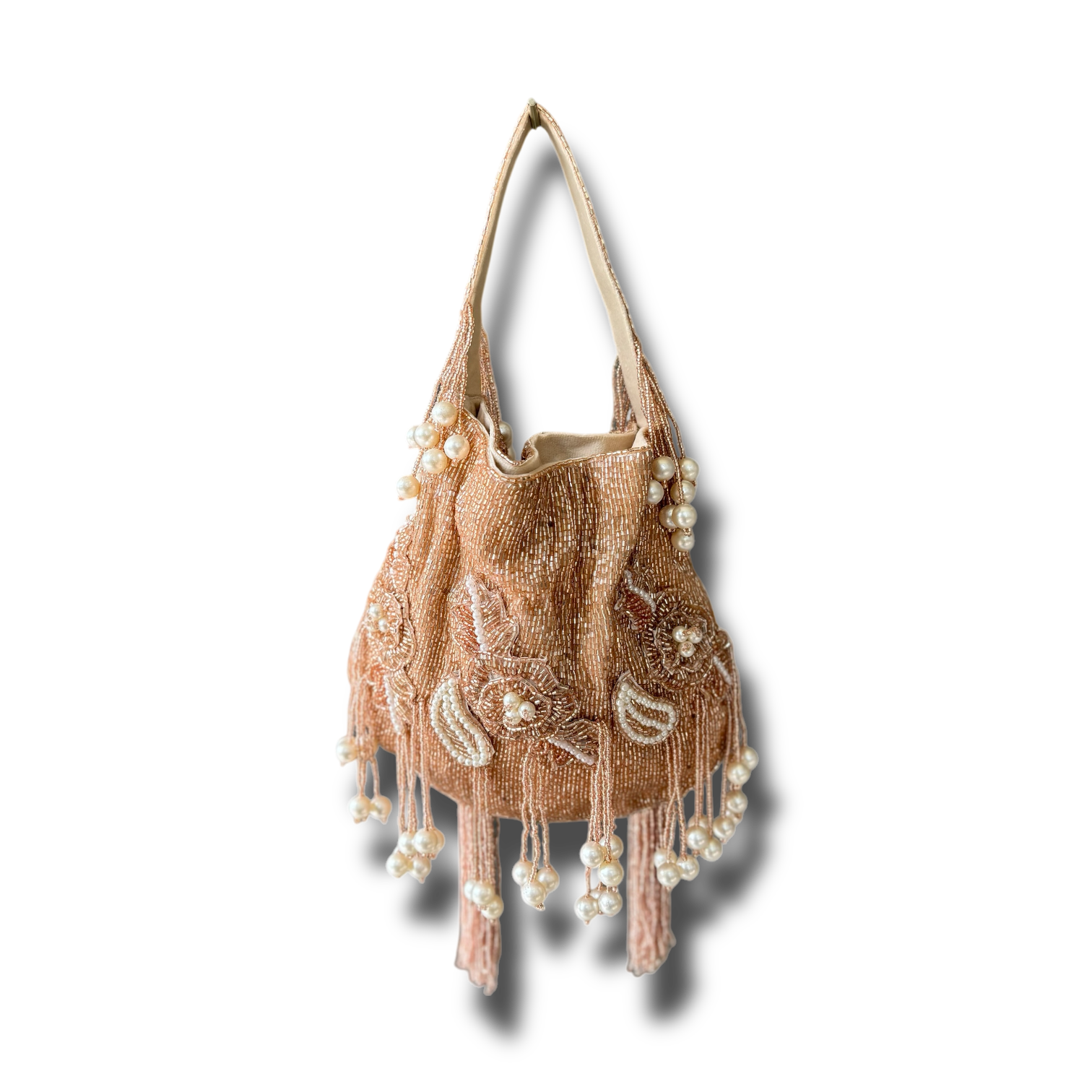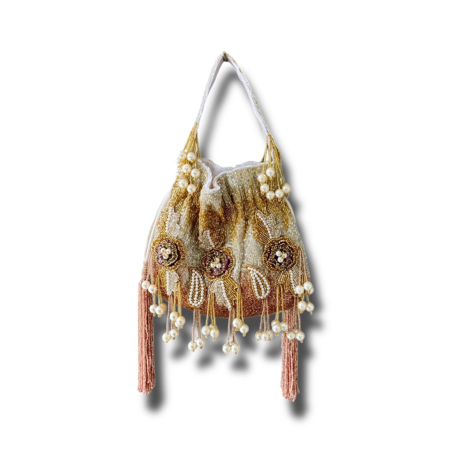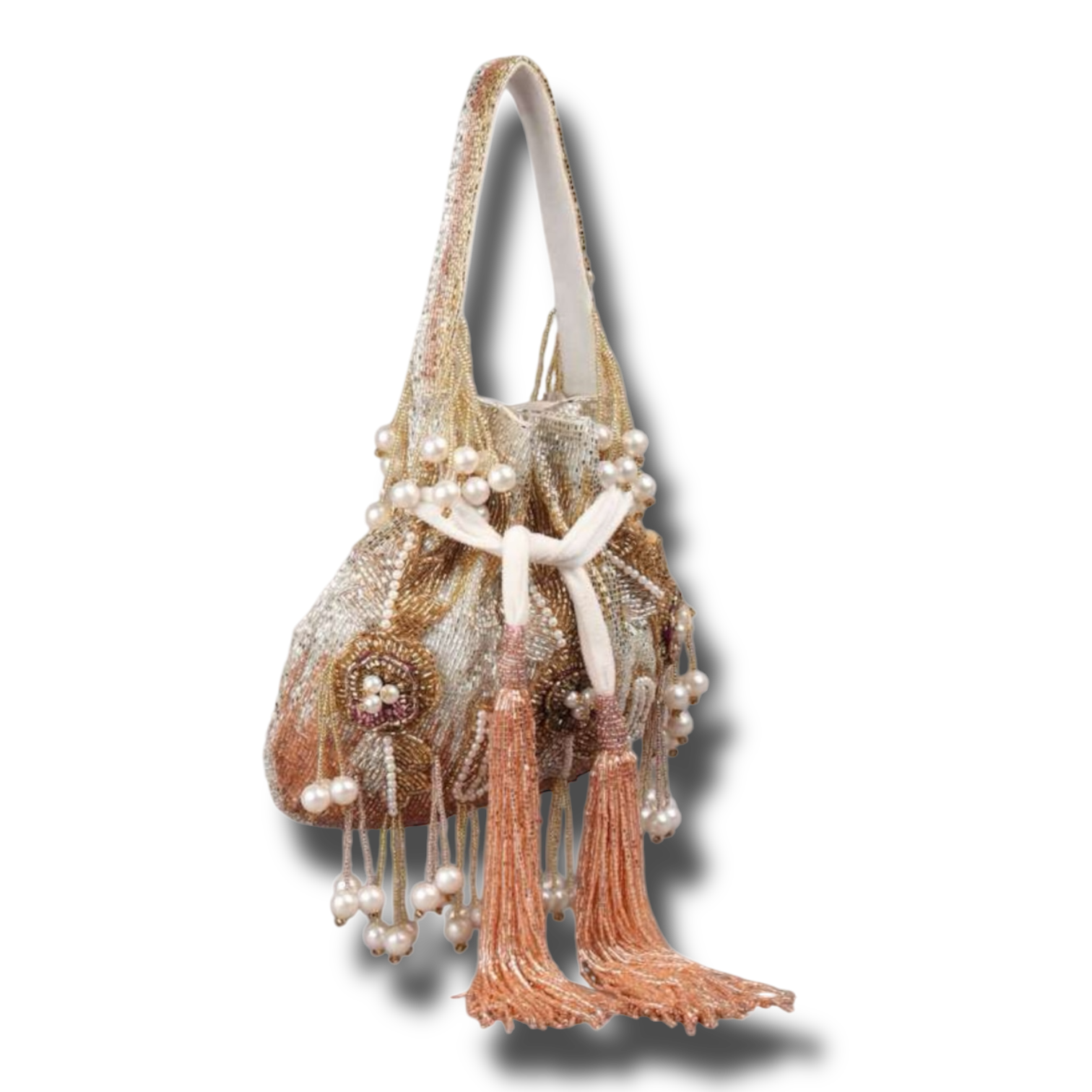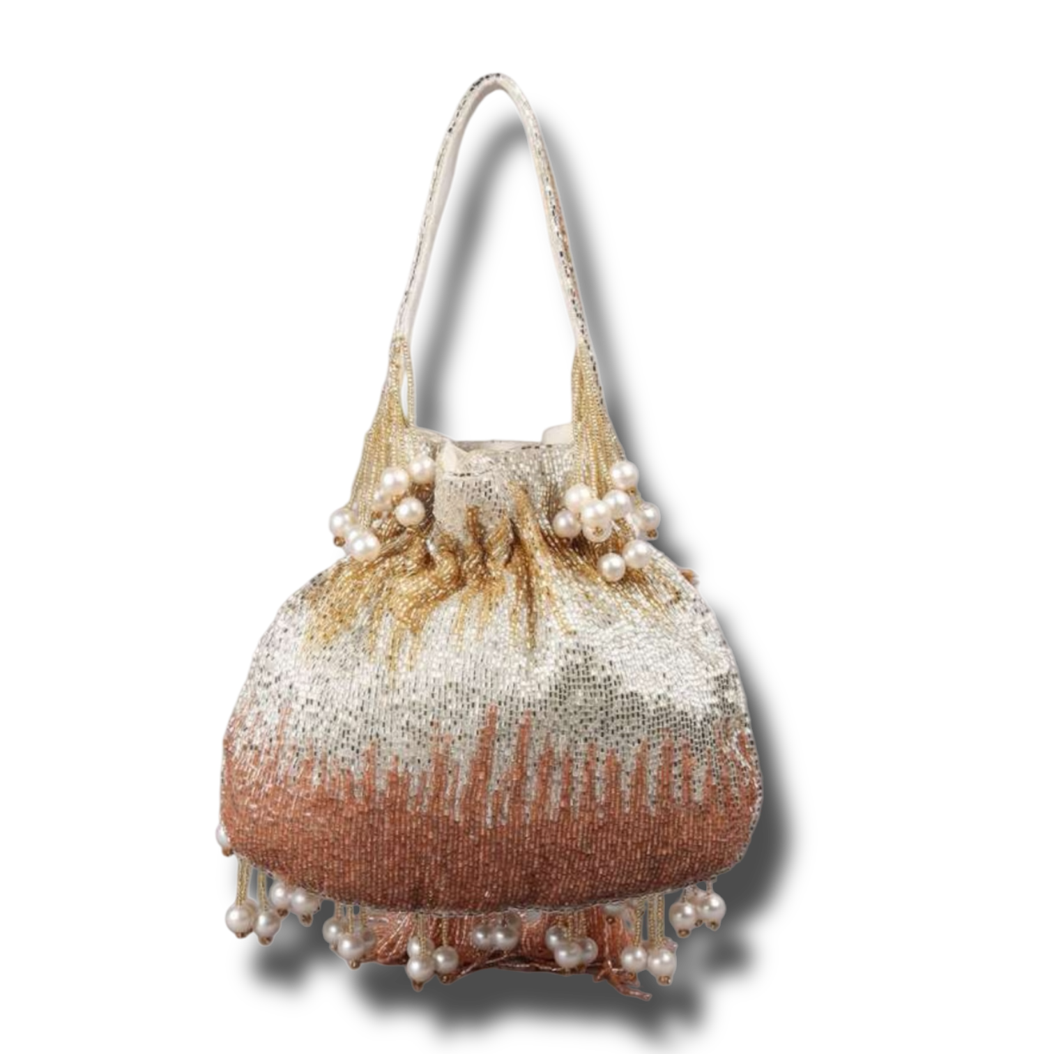 A beautiful Potli, featuring stunning cutdana work and available in a variety of colors. Completed with elegant pearl hangings, this is the perfect accessory for any special occasion.