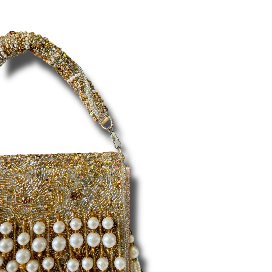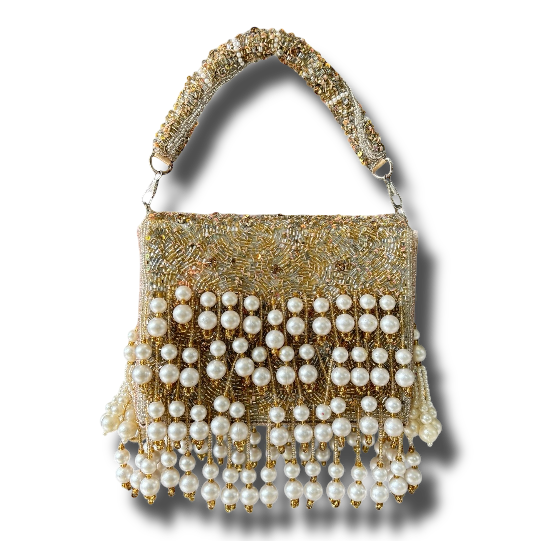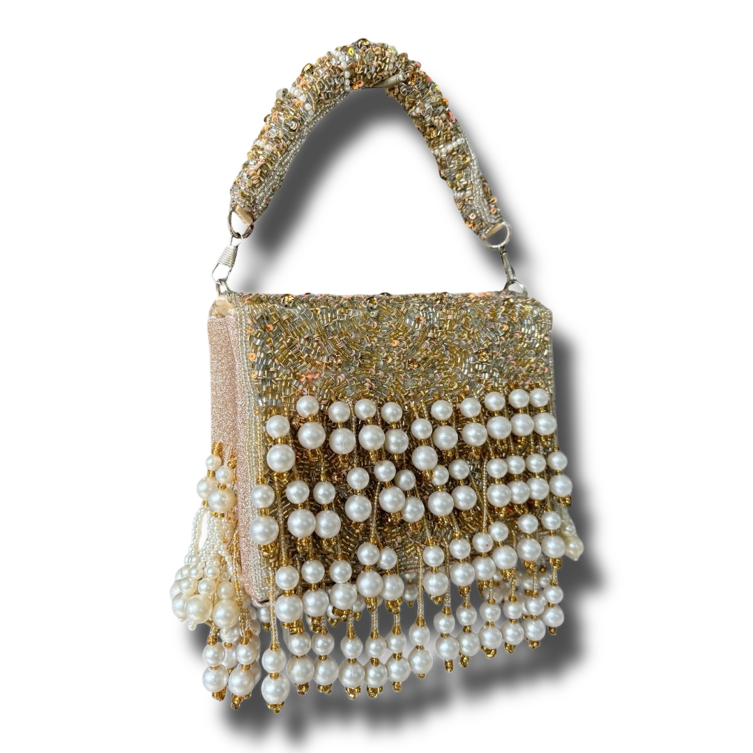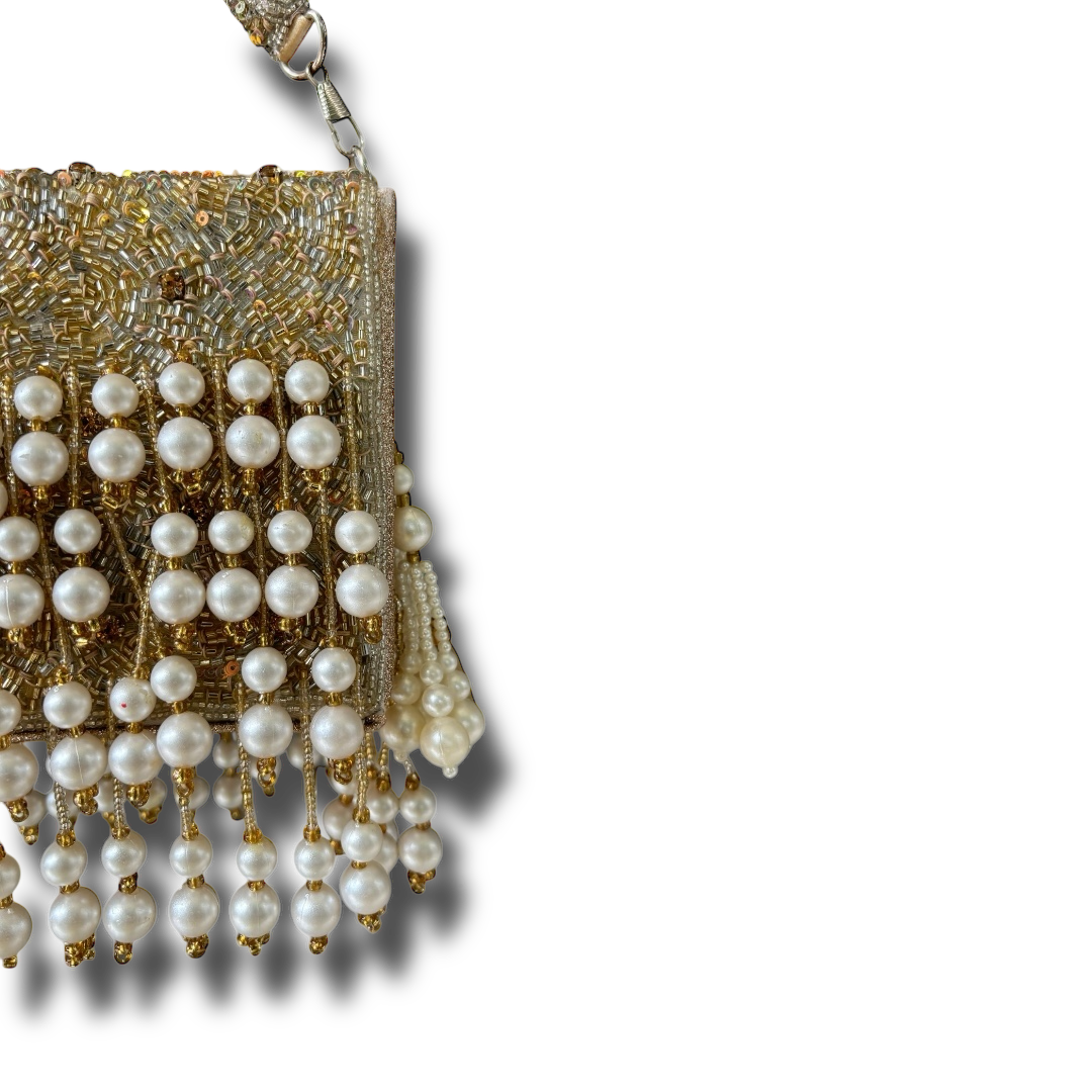 Expertly designed and elegantly crafted, the Nayab Pearl Bag is a must-have accessory for any fashion-forward individual. The golden color and stunning cutdana work make this handbag a true jewelry piece. Plus, with its lavish pearls and luxurious materials, this bag exudes opulence and sophistication.