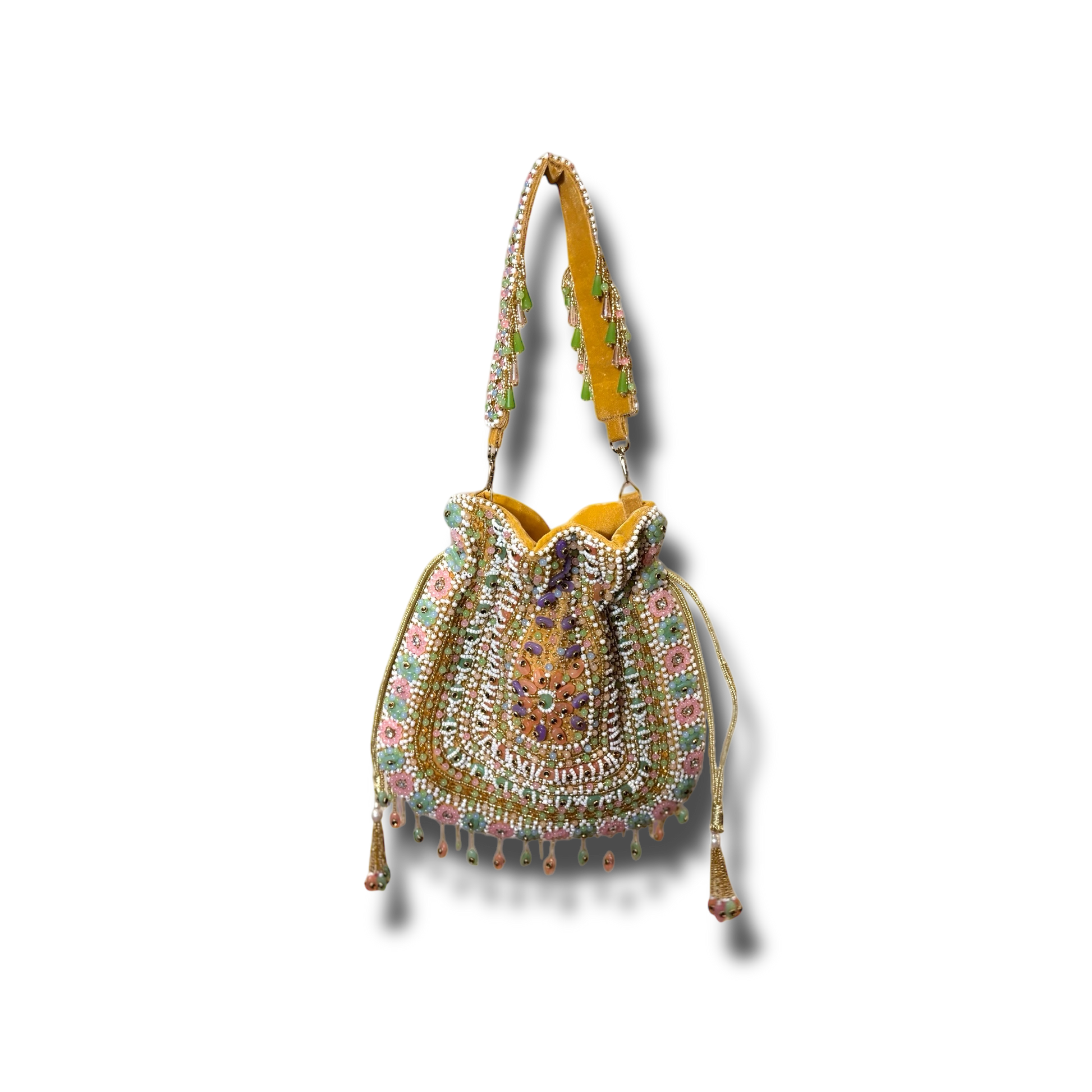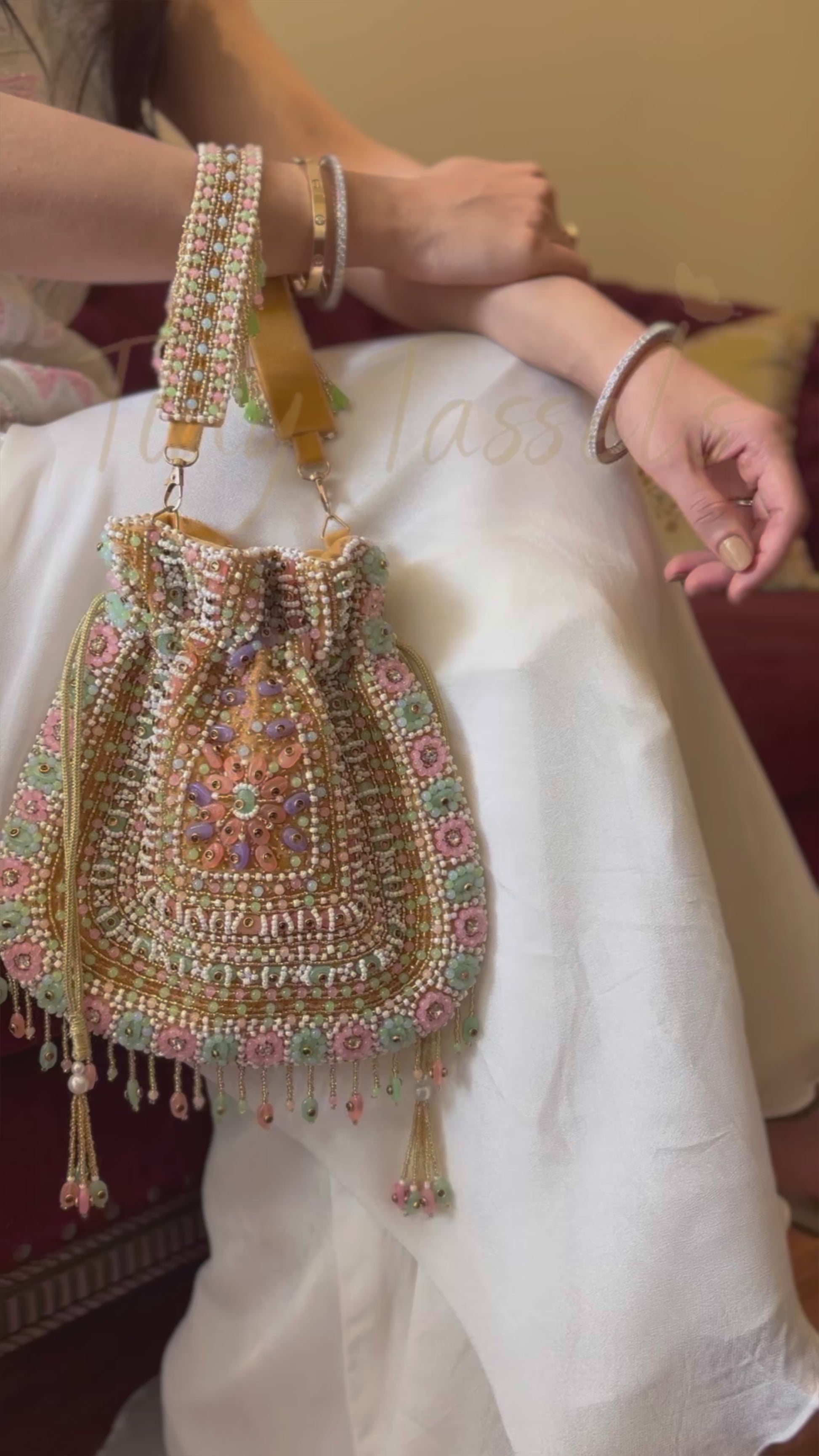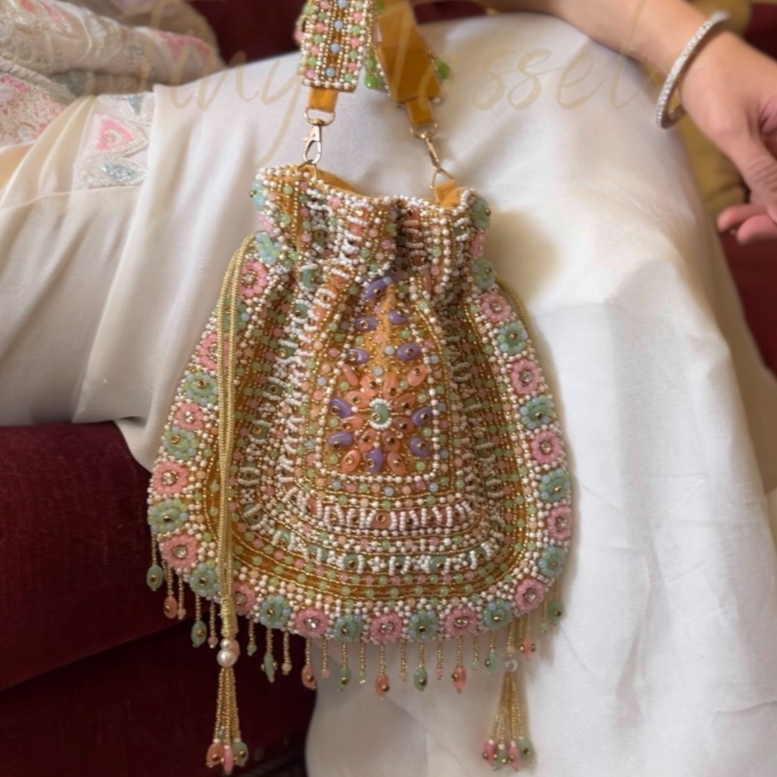 The Sheesha Potli is handcrafted with intricate, full-cutdana work. This distinctive potli offers a touch of luxury and timeless elegance to any outfit, making it a must-have accessory.